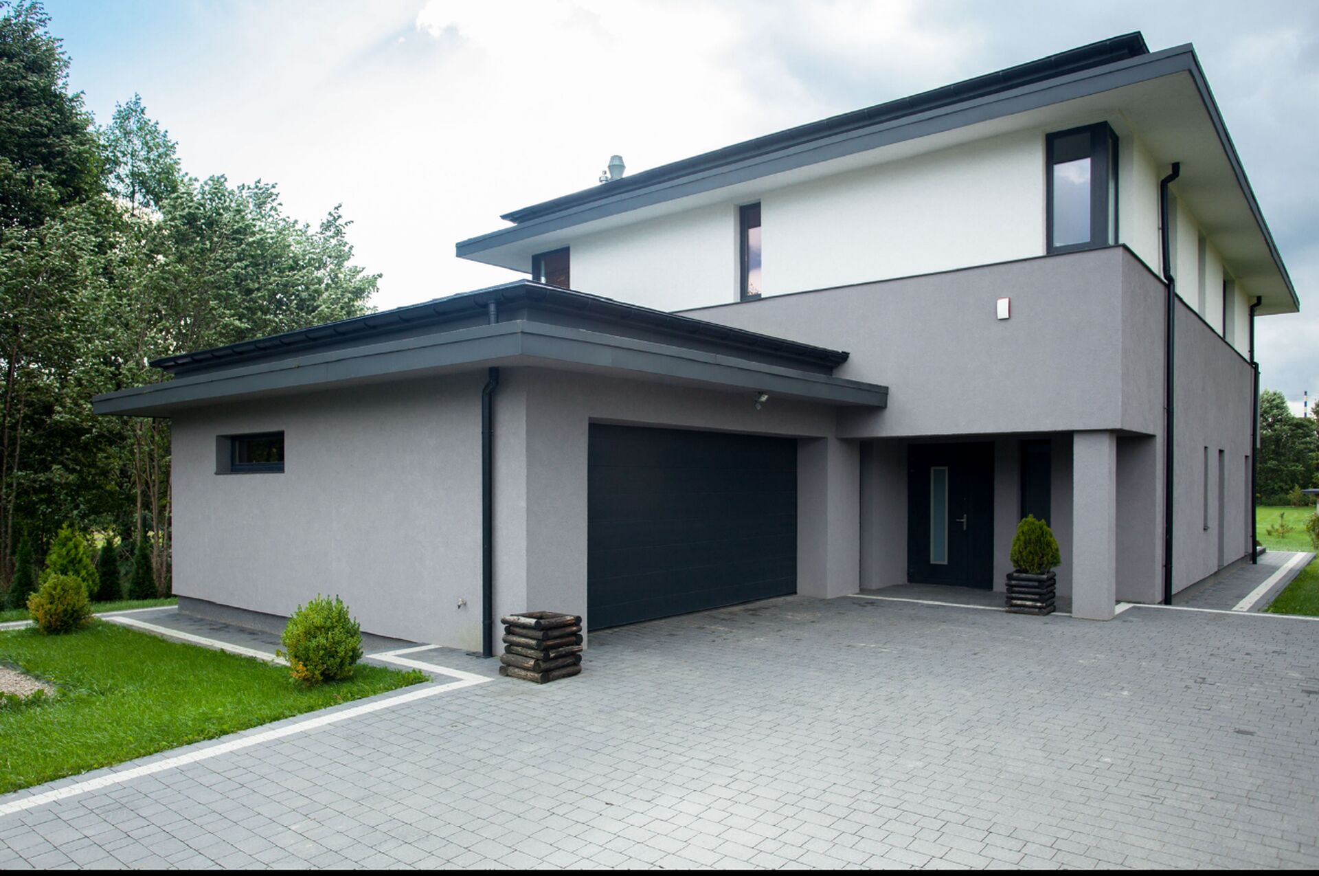 Cet enduit projeté assure une protection durable des façades contre l’humidité, les intempéries et les variations de température, tout en améliorant l’esthétique globale du bâtiment. Le contraste entre le gris et le blanc apporte du relief aux volumes de la maison et met en valeur ses lignes architecturales.